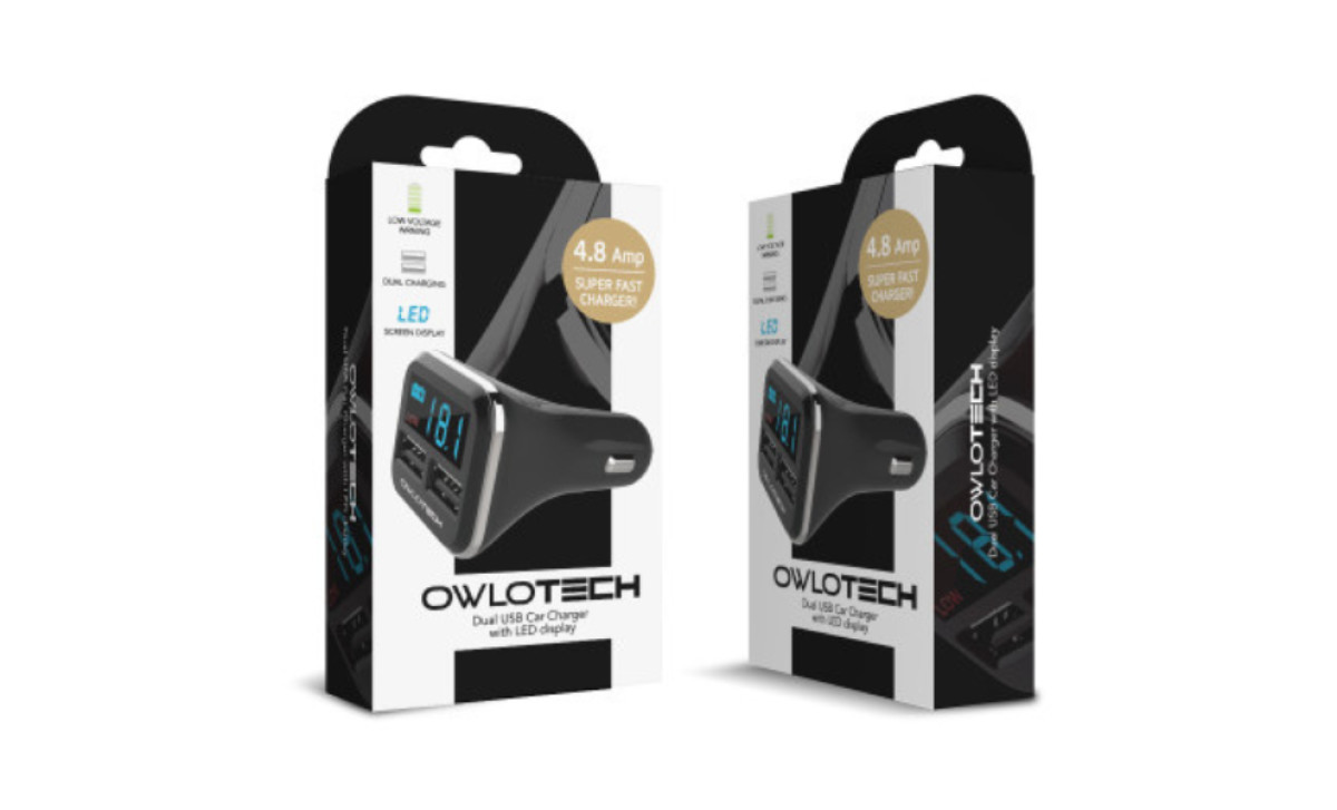 Goodway Design created a cool and tech-savvy packaging design for OWLOTECH’s Duo USB Charger. The box has an elegant black-and-white look with colored visuals indicating the product’s main features.
