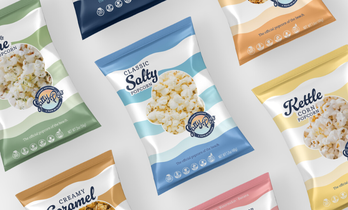Salty Pop Popcorn achieves this through wave-striped patterns, cheerful color coding, and a logo that reinforces its beach-day spirit.