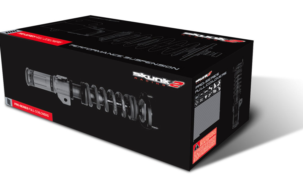 Greg Taniguchi's packaging design for the SKUNK2 coilover features a big black box that conveys a strong presence. Almost all sides of the box show large product images, giving consumers a glimpse of the item inside.
