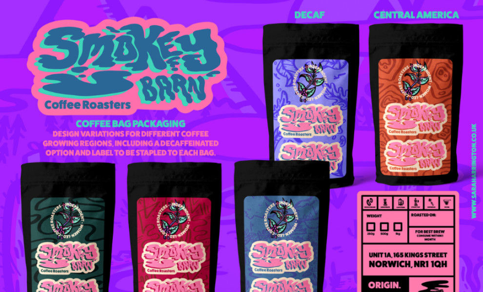 Smokey Barn Coffee Roasters’ packaging design is a vibrant blend of urban flair and a striking color scheme. Sara Harrington’s edgy design features street art backgrounds matching the graffiti-styled logo.