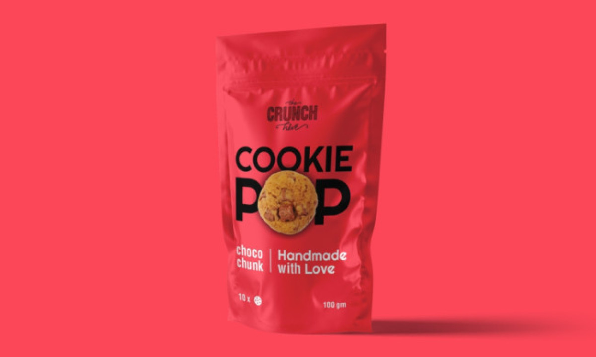 The bold sans-serif typography ensures the product name is readable and stands out, effectively communicating brand identity. This combination of functionality and aesthetics makes The Crunch Hive's packaging design a solid example of effective snack packaging.
