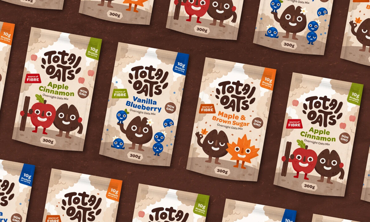 The Total Oats packaging strikes that balance by leaning into personality while keeping information easy to scan.