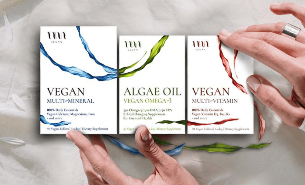 The packaging design for True Vegan's supplements combines minimalism with a pharmaceutical aesthetic to appeal to wellness enthusiasts. Kasia Wiercińska used minimalist white boxes to provide a clean, professional backdrop highlighting the product's purity and quality.