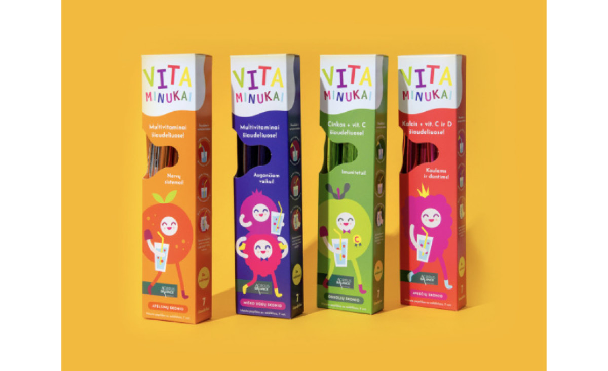Vitaminukai’s custom packaging design is courtesy of Ieva Paliukaityte. The long, slim rectangle is well-branded and full of vibrant colors.