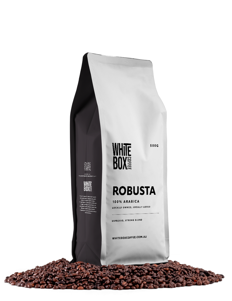 A vertical typographic hierarchy defines the design. The "WHITE BOX COFFEE" logotype is a bold, condensed sans-serif, with "COFFEE" set vertically on the side.