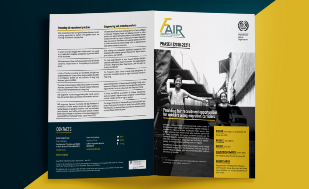Dina Alwani’s print design for International Labor Organization features clean content distribution with powerful and prominent images reinforcing the messaging.