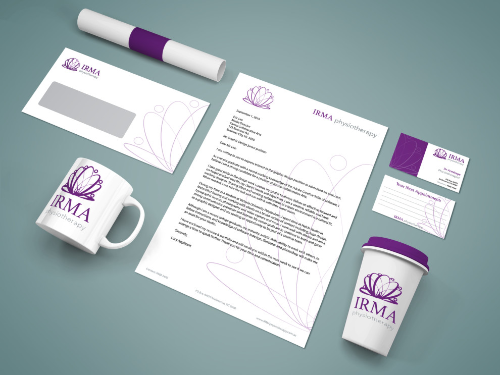 Melissa Whatman created the print design representing IRMA Physiotherapy, characterized by a uniform set of promotional logo-oriented materials to match the brand's joint concept.