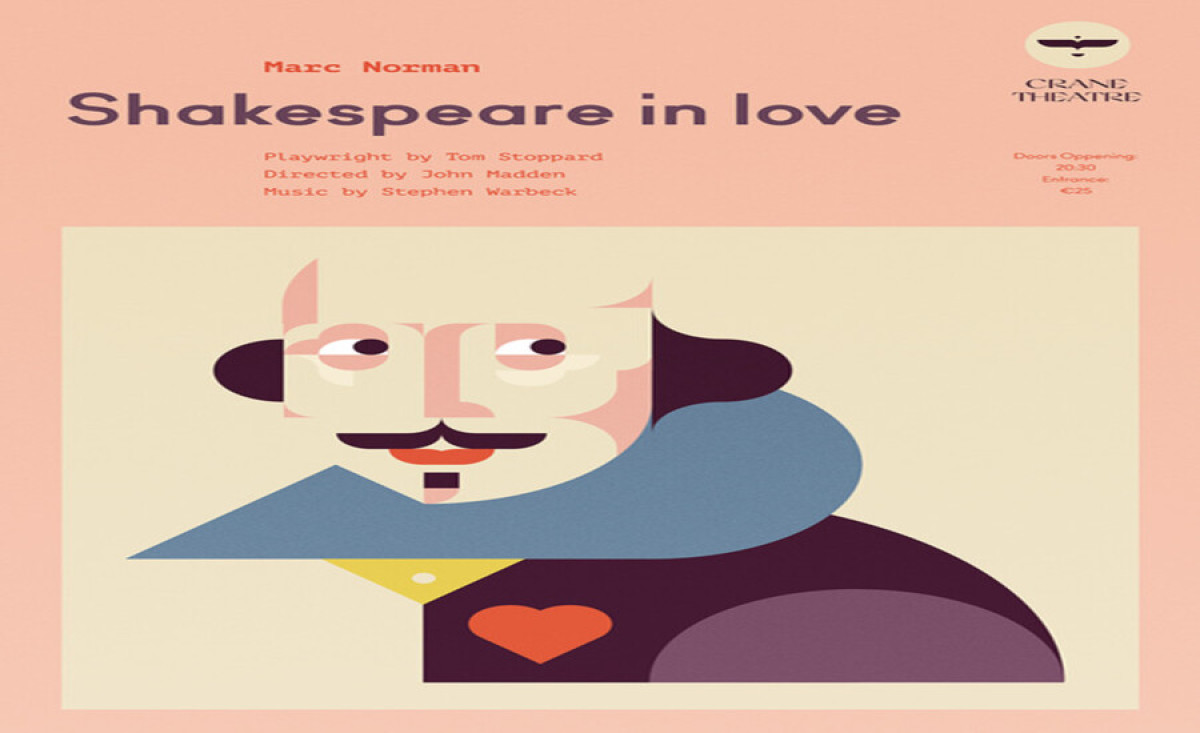 Studio Soleil's creation for the Shakespeare in Love poster incorporates modern design, appealing to a younger audience. The highlight of the poster design is a geometrical stylized illustration of Shakespeare in pastel colors. The agency used dreamy and romantic colors, alluding to the nature of the story.