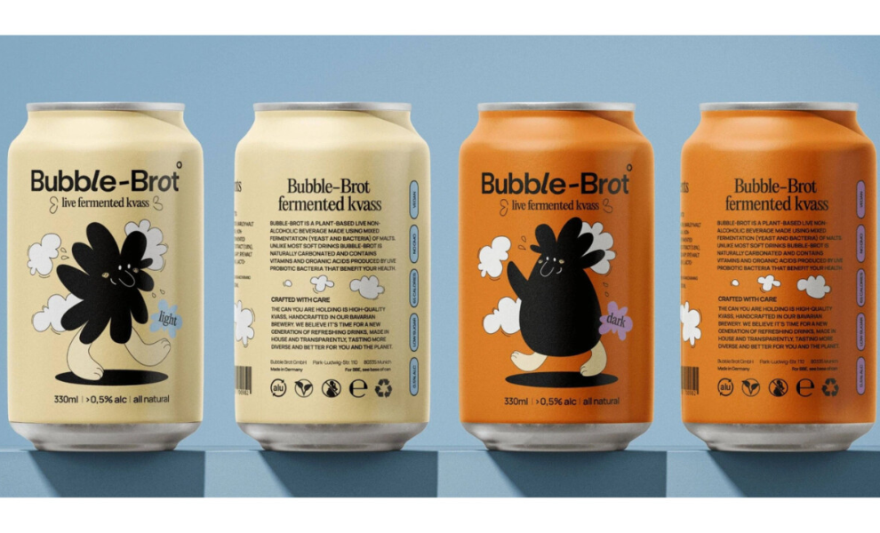 Bubble Brot reintroduces kvass, a traditional fermented drink made from malt, yeast, and beneficial bacteria, through a visual identity that feels current and easy to approach. The packaging leans into naive design with playful illustration, character-led graphics, and a looseness that signals something made by hand without feeling dated.