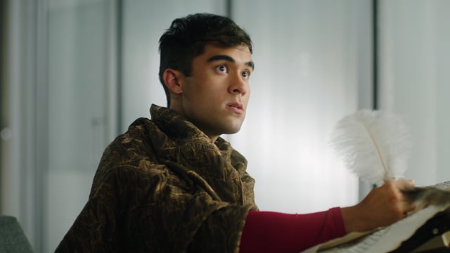 The woman asks her male colleague how he feels about their "new copier." Rather than replying with words, the man responds with a confused, almost shocked facial expression. The next shot shows us the revolutionary machine – a guy sitting on a sofa. We see him using an inked feather as he scribbles on a medieval papyrus.