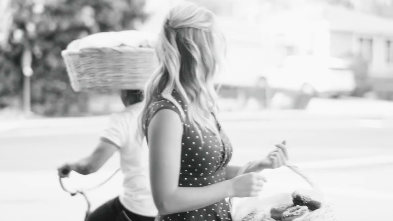 The video starts with a black-and-white, old-school way of getting donuts. We see a man with a mustache with a huge bin full of donuts balanced on his head, resembling a giant sombrero. He's driving his bicycle on the street, stopping to serve a single donut to a lady on the sidewalk. The view is accompanied by a presumably Mexican uplifting tune.