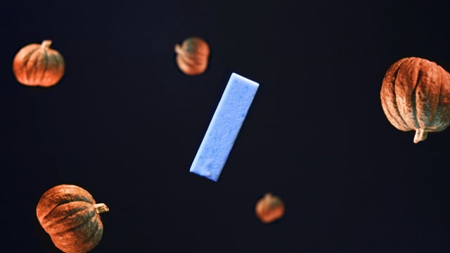 Amid them, a pack of gum seemingly “arises” from the grave, shaking the dirt and dust off and projecting itself in the air. This playful “back to life” metaphor transforms into a more familiar commercial concept, so the video extends to highlighting the product against a pitch-black background with pumpkins rotating around it.