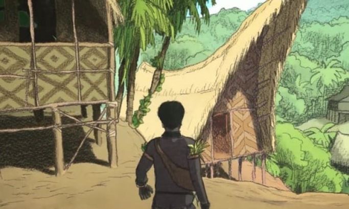 Movement is almost exclusively reserved to the forefront of the camera, with the background motionless and flat, yet still colorful and lively. The film takes place on a beach or island, and a stark contrast between the old world and the new world come head to head with the presence of a tribal settlement and a war cargo depot. This contrast is the basis for the film’s simplicity—the color palette is limited, shading is conservative, and a guitar, vocals, and tribal drums make for the music score.