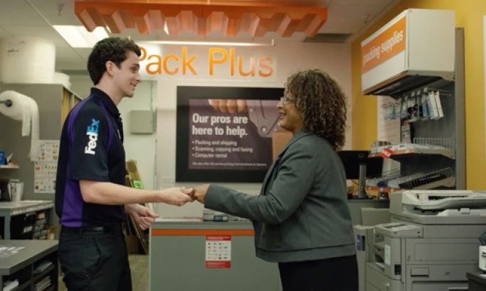 The next several shots depict Walmart customers having positive experiences within FedEx Office. This is one of the main themes of the video, and is shown by having employees dressed in FedEx purple smiling and helping customers with whatever they need.