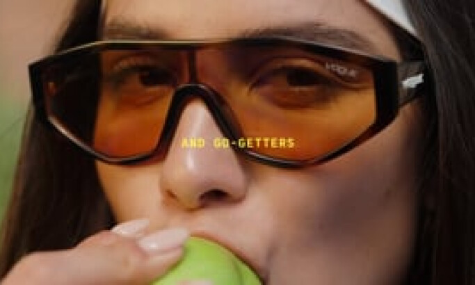 The typography is bold and high-contrast. A bright yellow, all-caps coding-style font serves as narrative markers. The vintage flair of the font contrasts strongly with the fast-moving video, lending a human-made quality to the messaging.