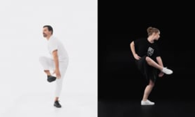 A key feature is the video's use of a split-screen composition. A dancer in white is on a white background, and a dancer in black is on a black background. As the choreography unfolds, the two halves gradually merge.