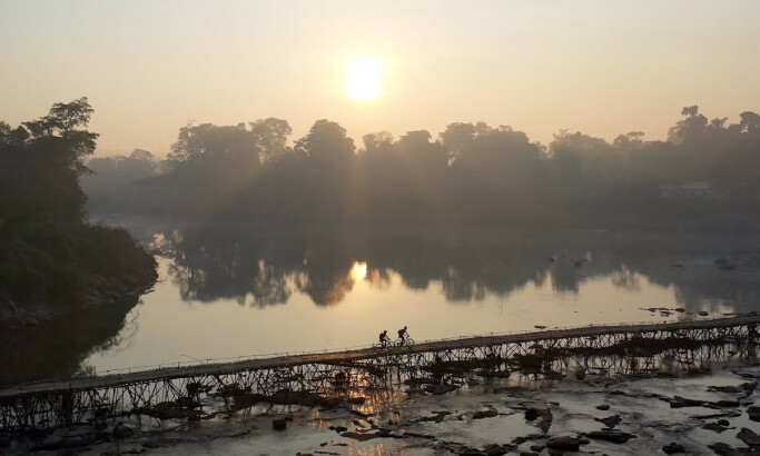 The video combines first-person biking sequences with sweeping drone shots over remote, overgrown Laos trails. This contrast between up-close, handlebar-mounted footage and vast aerial views deepens the spatial experience and enhances the immersive quality of these adventurous scenes.