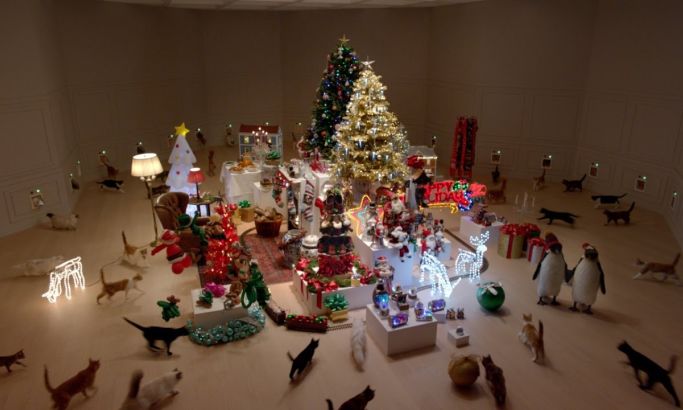 The video starts with presenting a near-perfect decorated simulation of a Christmas festival. It has a very festive, joyous, and colorful vibe. It features trees, decorations, clockwork rails and mice, toys, candy, and other festive decorative pieces. There’s also a cuckoo clock, and it all seems perfect until the clock goes off and the doors open, letting in scores of cats who wreak havoc on the perfect Xmas set up in mere seconds. The cats are shown clawing away at all the precariously positioned decoration pieces and objects and eventually leaving abruptly once the room has been ruined.