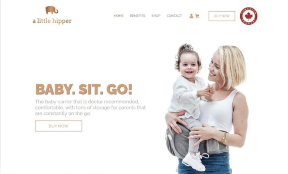 On the Benefits page, you'll see heartwarming visuals displaying how to use the product. X-ray-like illustrations depict a baby's incorrect and proper posture when parents carry them.