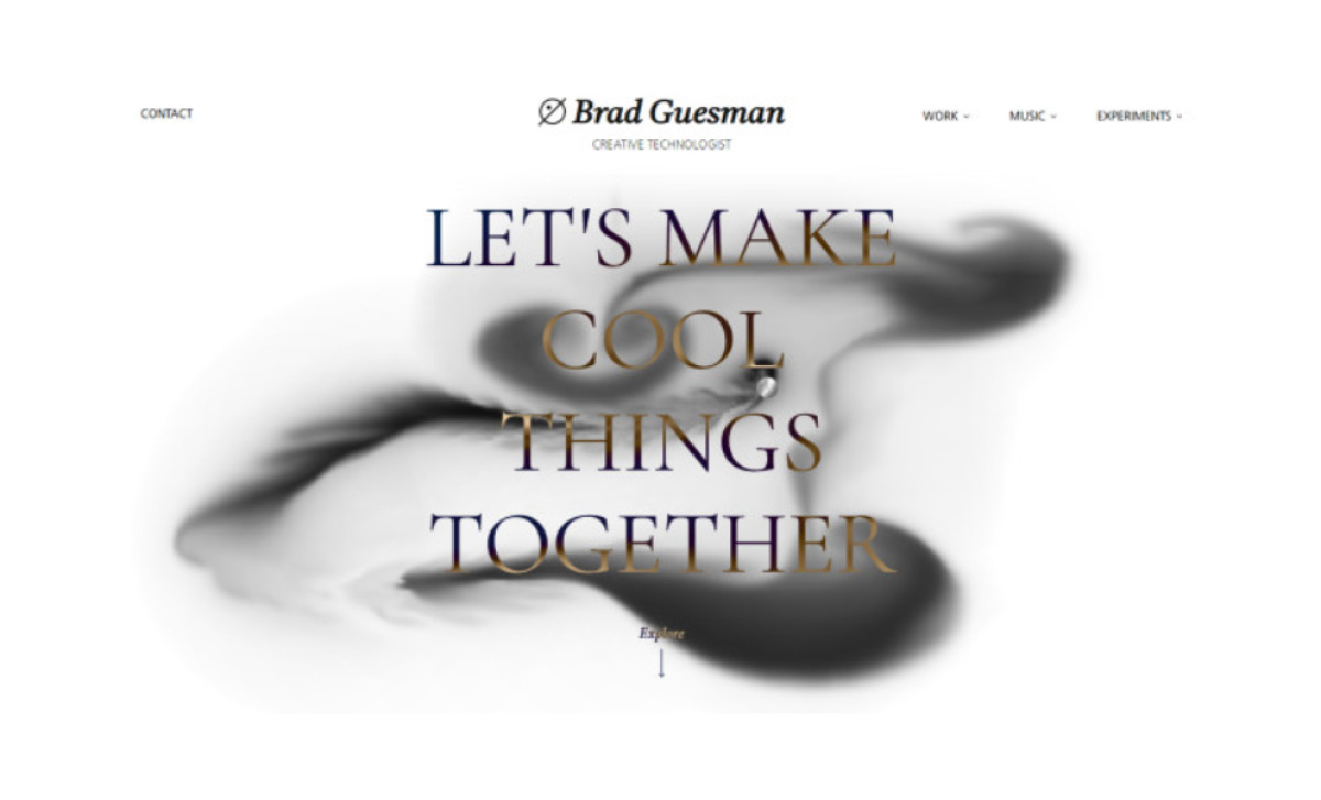 From the get-go, Brad invites you to participate in this playful design by providing a mixture of cursor effects that vary depending on the section you’re visiting. The hero section features a call to action written in black glossy letters that turn copper as you hover over or near them. The cursor movement releases black ink that alters the color and lets you play around with the shapes.