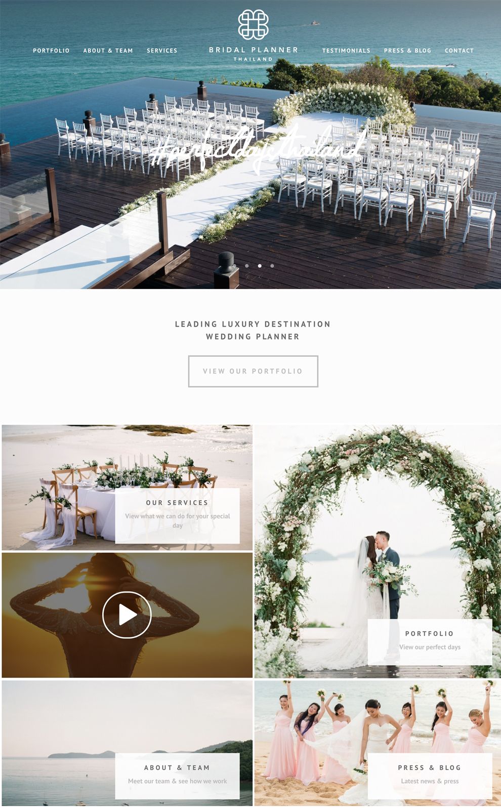 The “Homepage” provides all useful inline linkings for the visitors to explore deeper. The “Portfolio” landing page demos the wide range of the wedding styles they have created.