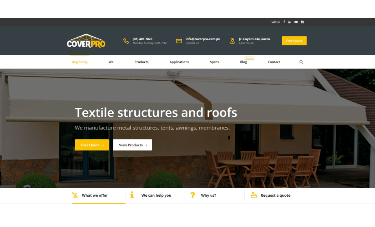 This site prioritizes driving quote requests from potential customers. Bright yellow "Free Quote" buttons and other calls-to-action are highly visible and consistently placed in top spots. This makes initiating contact straightforward, reducing friction in getting a tailored project quote easily from CoverPro.