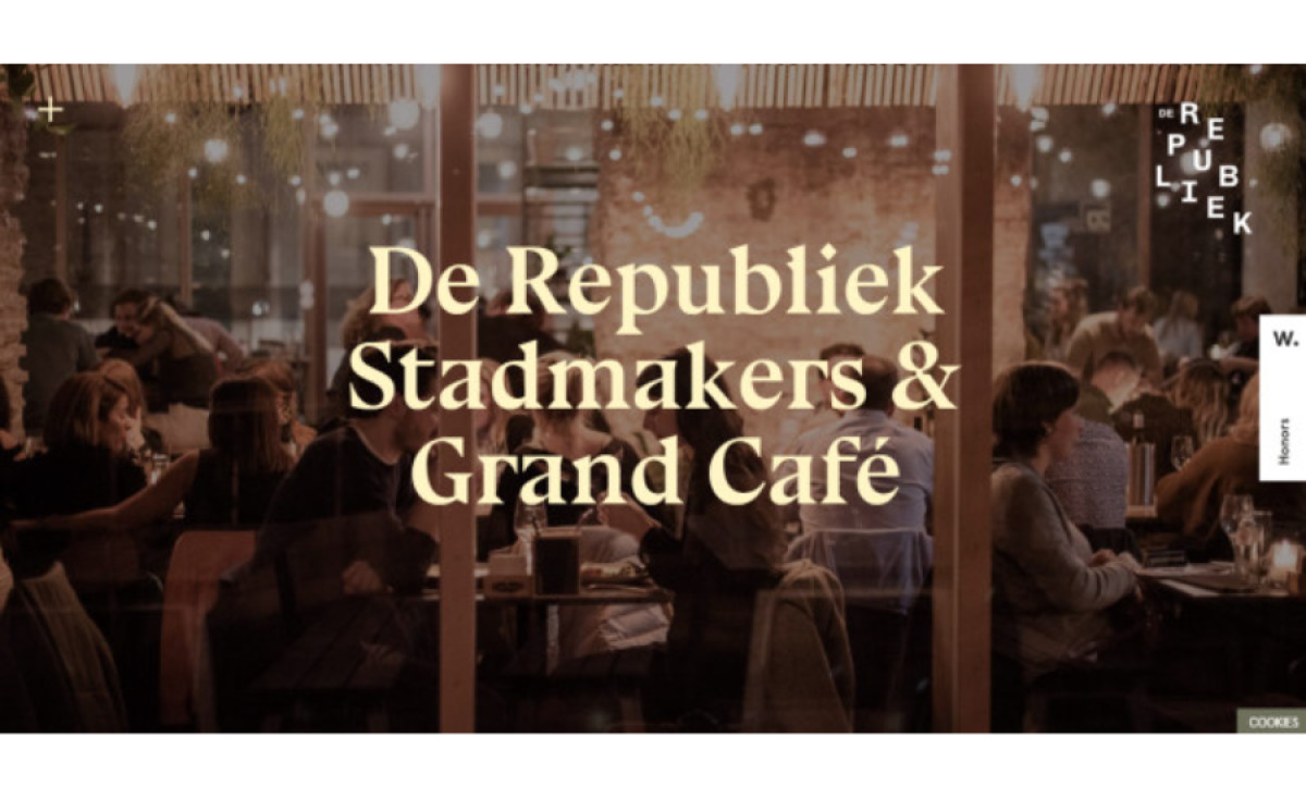 The sticky “+” button opens up a full-screen navigation page prompting site visitors to explore De Republiek further and find more specific selections.