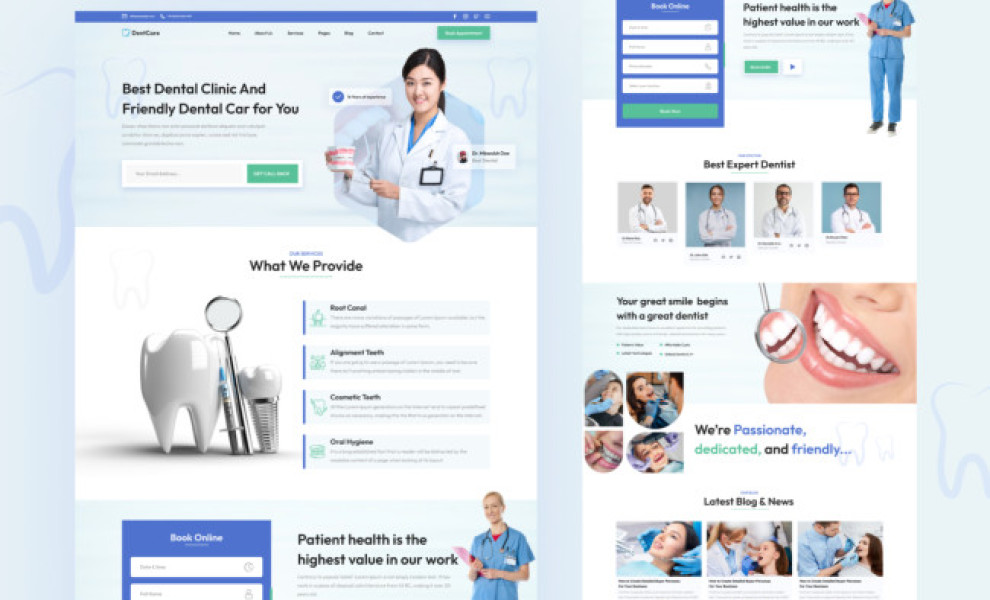 Codeflash Infotech is behind our next choice for the best dental web design list. The agency’s concept for DentCare’s landing page is built around reliable staff photography and a neat blend of dentistry colors.
