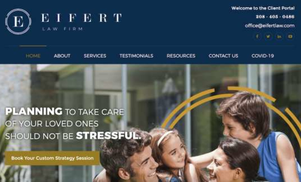 The website for Eifert Law Firm by Spotlight Branding continues with the use of dark blue/navy color while employing large fonts, cheerful stock imagery and asymmetrical layout to discuss the company’s UVPs.