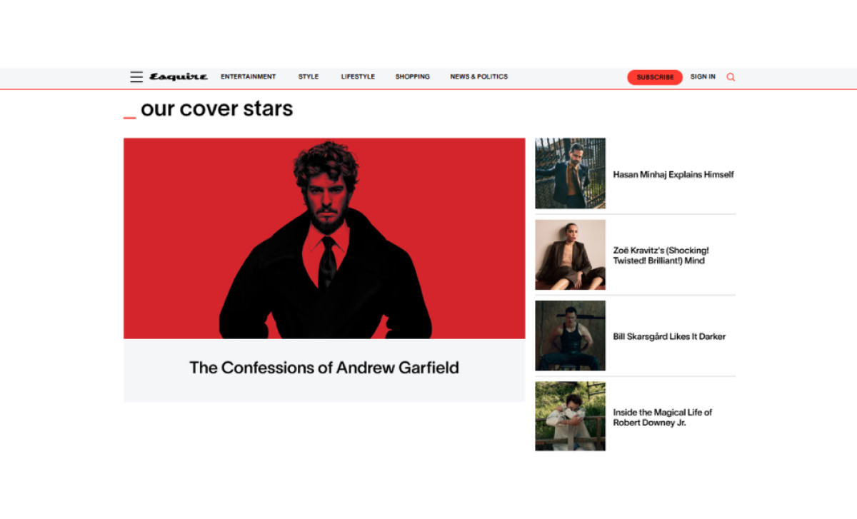 The dynamic nature of the homepage is amplified by occasional grid-breaking elements, where specific articles are given full-width rows. This break from the traditional grid layout makes Esquire's website design stand out among digital print media websites.