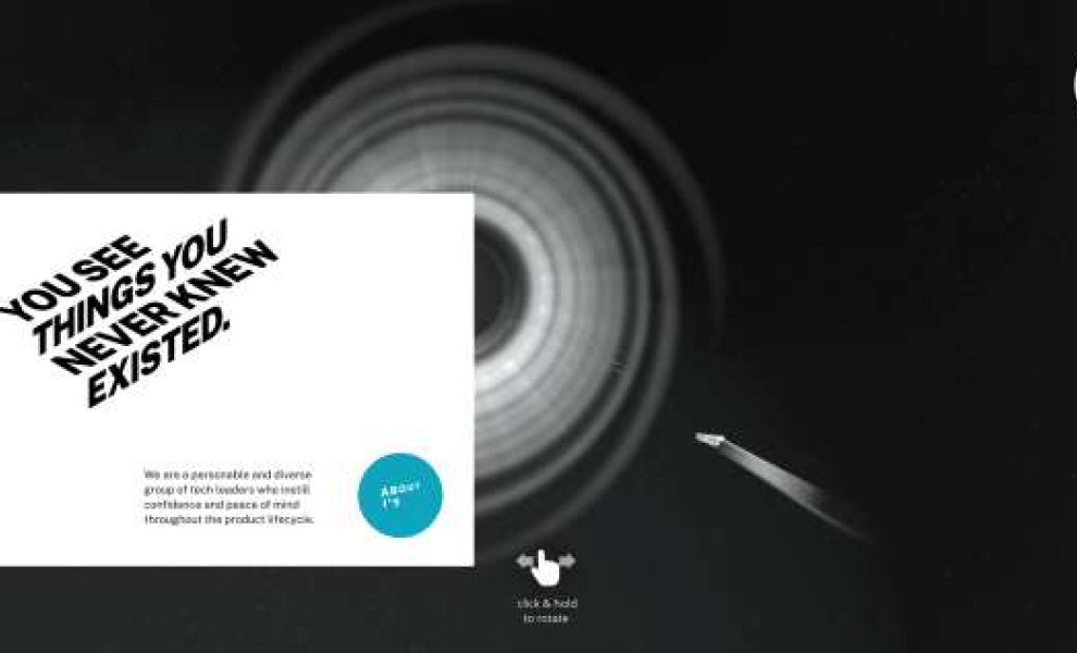A seamless animation featuring a 3D iteration of the logo opens the user journey before landing on a black and white homepage where users can click and drag across the screen to look at the animated spaceship speeding towards a vortex.