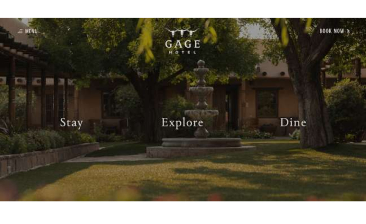 EyeLikeDesign’s website design for Gage Hotel begins by displaying the lavish courtyard exterior of the luxury establishment. Hovering over the three succinctly titled CTAs – “Stay,” “Explore” or “Dine” – loads equally stunning images of the hotel’s other amenities, including its rustic interior.