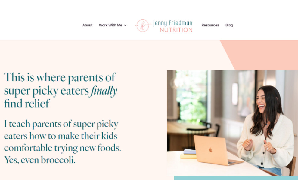 Inkling Design crafted a web design for parents seeking guidance on their child's diet, tailored to reflect Jenny Friedman Nutrition’s core values. The design’s soothing pastel color palette fosters a welcoming and encouraging ambiance. This choice sets the stage for a supportive experience, ensuring parents feel supported as they seek guidance.
