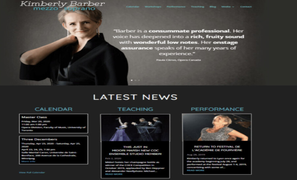 At the forefront, the hero section spotlights glowing testimonials from past collaborators, underscoring Barber's versatile talents. A neatly organized news bulletin follows, keeping visitors updated on her latest endeavors.