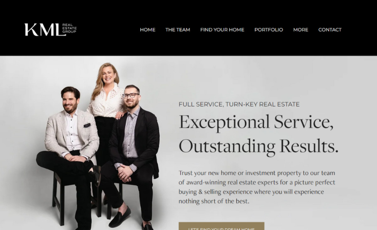 The website's hero image features a striking group photo of the KML team alongside the tagline "Exceptional Service, Outstanding Results." This immediately sets the tone for KML's brand promise, showcasing KML's expertise in the luxury real estate market.