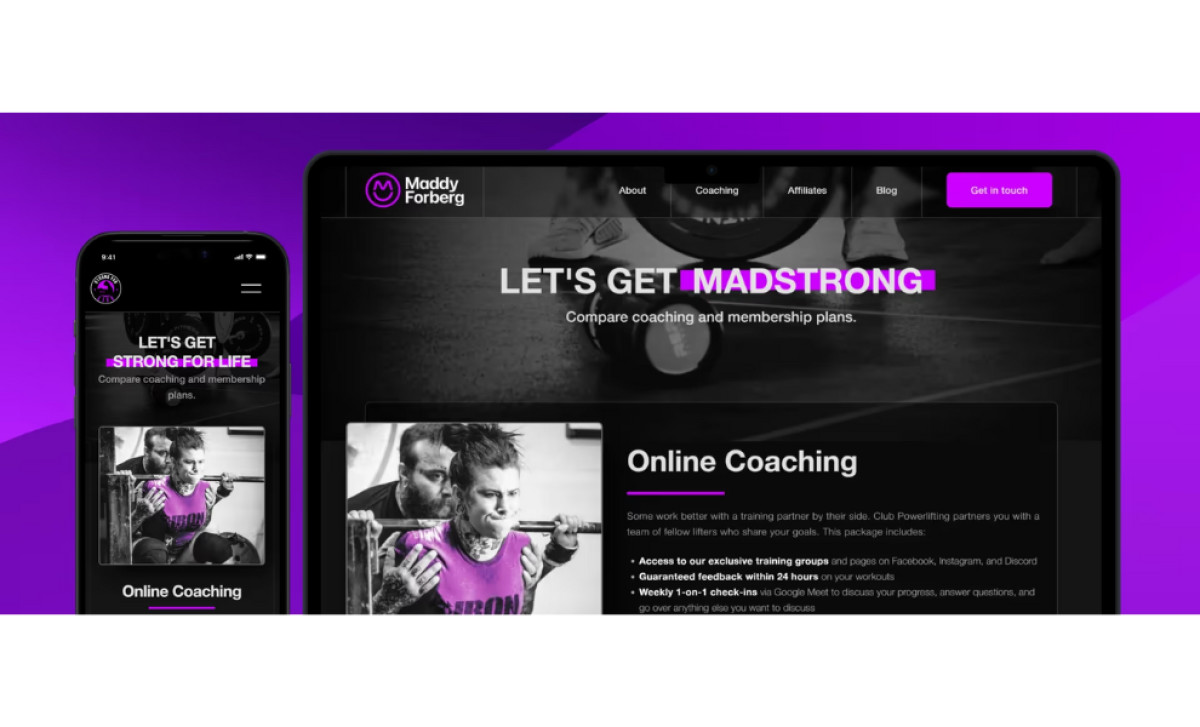 The web design embraces a monochromatic palette with vibrant purple accents. The black-and-white base lends the site a sleek and professional appearance, while the purple hues symbolize ambition and strength — key qualities of Maddy Forberg and her fitness ethos.