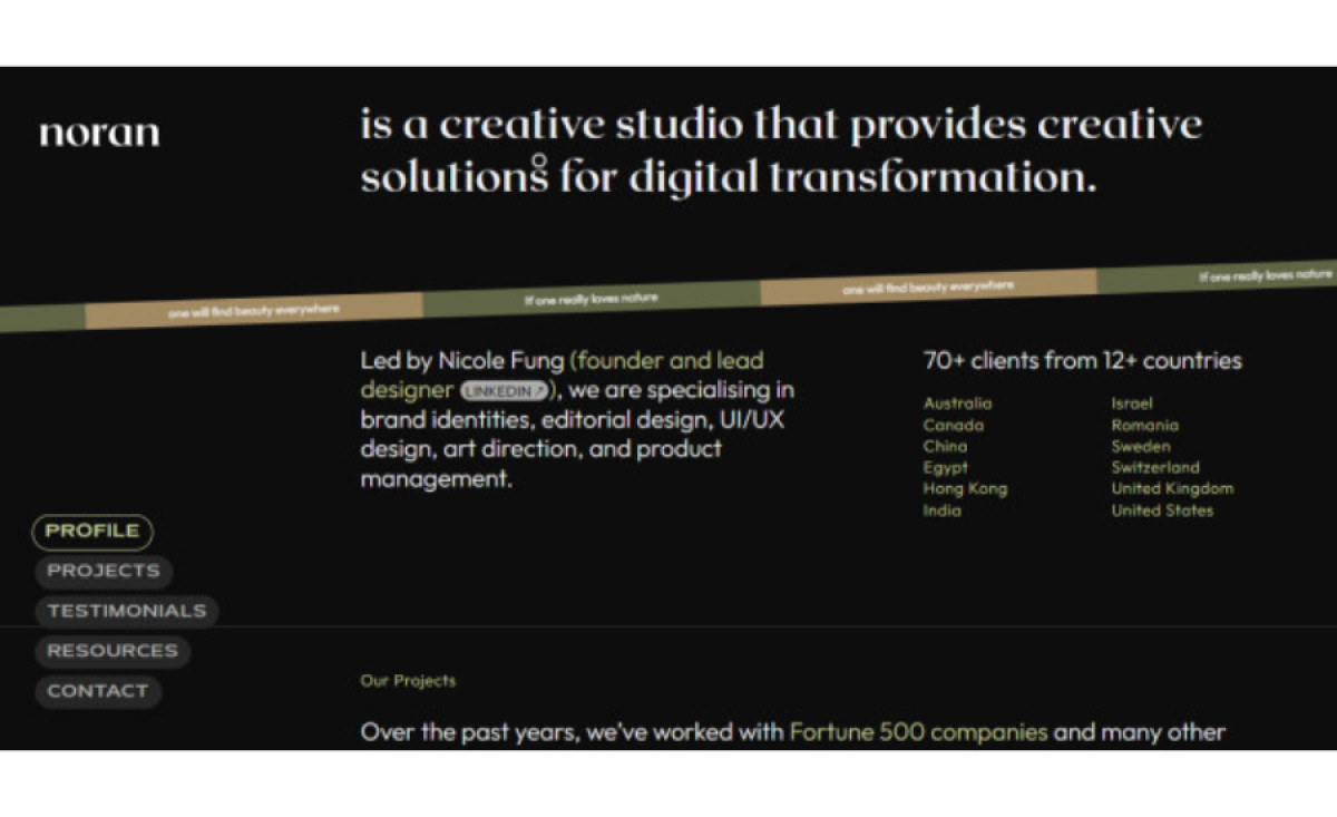 With this design, users don’t have to jump from one page to another to learn more about the agency. The banner alone already displays all the essentials: who Noran is, what they do, and their clients and locations.