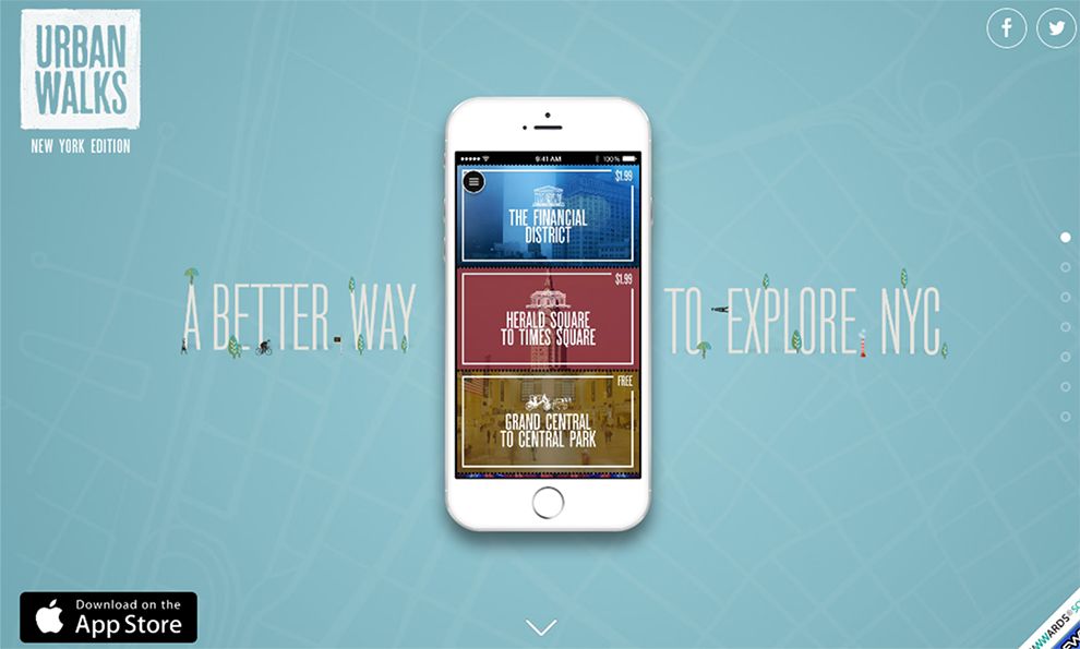 Throughout the scrolling journey, the site's universal elements remain in the same place on the page and do not move. This feature is ideal for app websites, as users can then easily access social icons (located on the top right for Urban Walks) and the "Download on the App Store" button (found here in the bottom left corner).