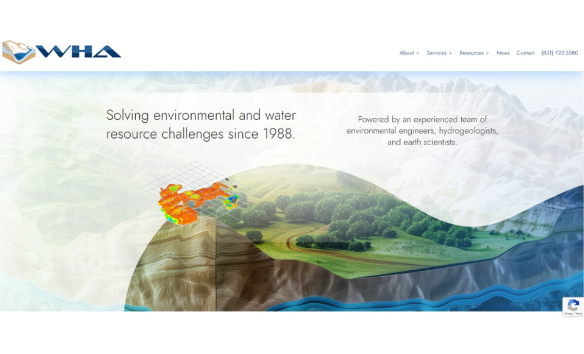 The homepage makes an immediate impact with a cross-sectional terrain visualization that conveys WHA’s connection to geological and hydrological work. This carefully chosen hero section doesn’t just look good — it communicates the firm’s depth of service and scientific focus from the very first glance.