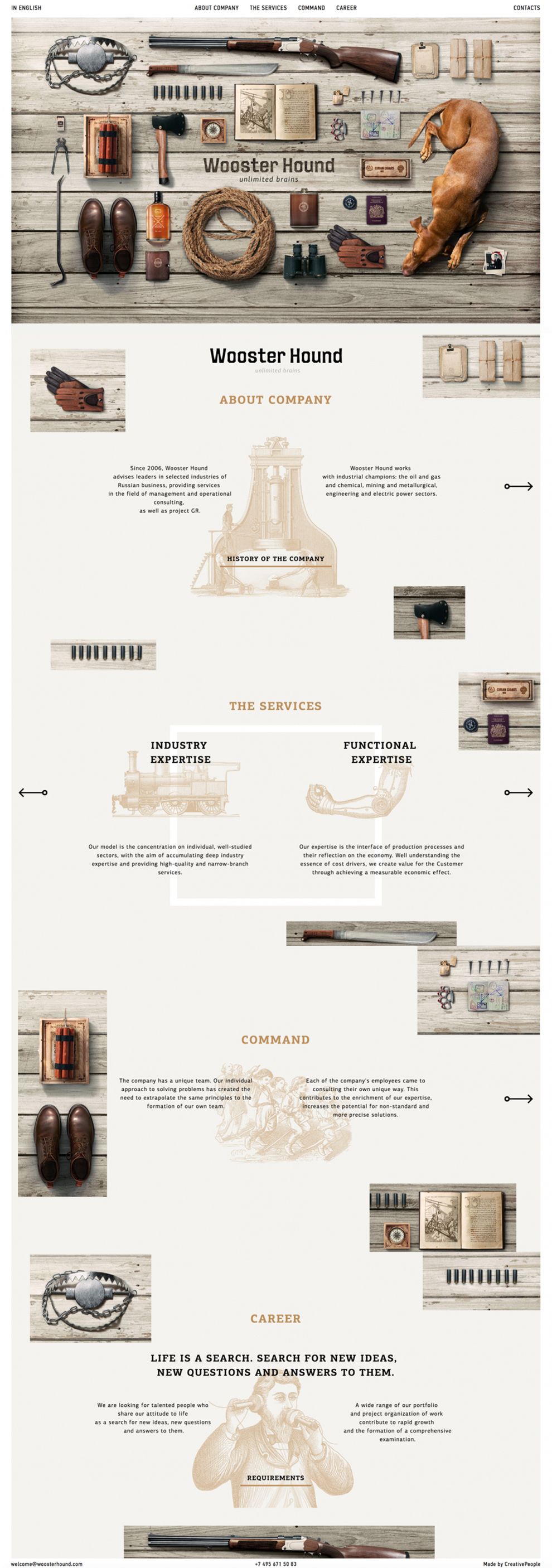 We love everything rustic and vintage. The type of imagery used on this website's banner just works, from the elements to the colors to the font face. And when you have great photography, it's a lot easier to have a beautifully designed website. As you scroll, you get to know more about the company. The first section has a content slider explaining who they are, from their history to the people collaborating with the company. The next section is all about the services, again presenting the content in a slider.