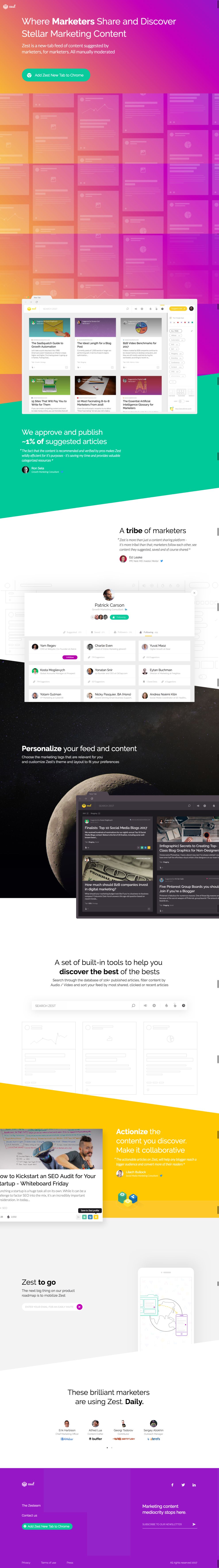 As a whole, Zest’s colorful site aims to introduce users to their Chrome extension. Steady organization and informative articles work together to develop Zest’s image—one that potential marketers can depend on for helpful information.